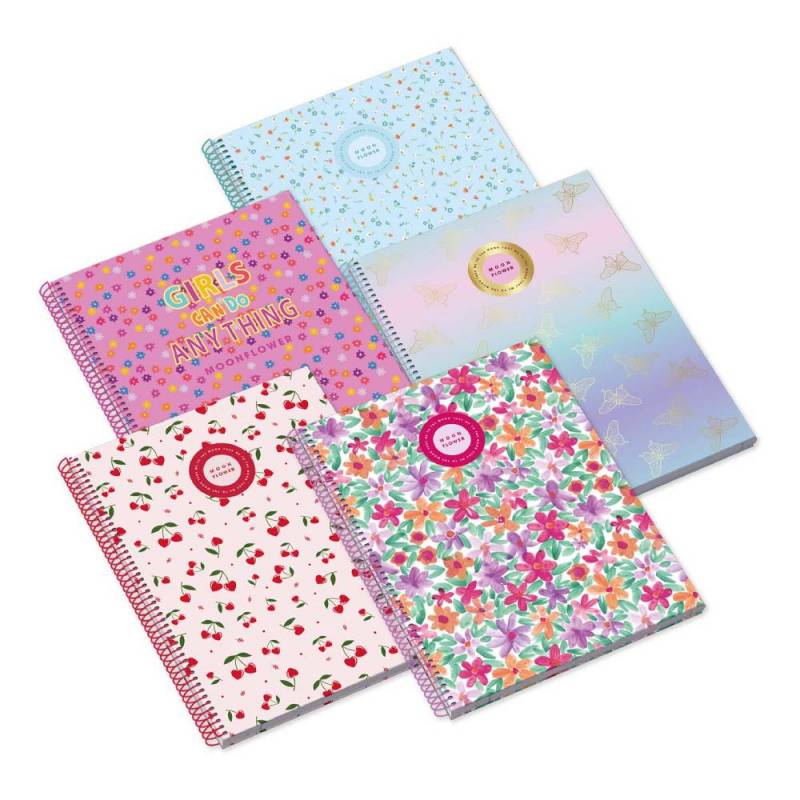 Moonflower Cherry kollekció A5-ös méretű, kemény fedeles, vonalas spirálfüzet. Borító: Különféle minta