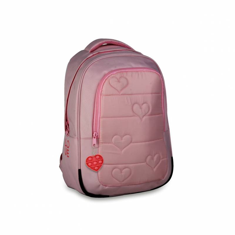 Méret: 42 cm Űrtartalom: 30 liter – bőséges hely könyveknek, felszerelésnek Anyag: Poliészter és nylon kombinációja, steppelt mintázattal Díszítés: Szitanyomásos minták Cipzárhúzók: Fém húzók szalaggal díszítve, könnyű fogásért Kiegészítő: Trendi pop-it játék az elején – extra szórakozás és egyediség
