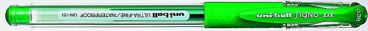 Átlátszó, műanyag tolltest, gumi ujjpárna, műanyag klipp, rozsdamentes acél tollhegy, kupakos kivitel, a tinta színével megegyező klip, fogórész és tollvég, rövidített, „ingzseb” tollszárral a finom írás kedvelőinek, extravékony íráskép, apró szövegek olvasható írásához, víz- és UV-álló, fényes íráskép (nem fakul ki, hosszú ideig látható marad), vonalvastagság: 0,25 mm, golyóátmérő: 0,38 mm, cserélhető betét: UNI „UMR-1”