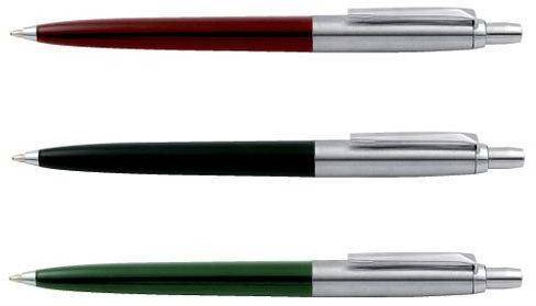 Nyomógombos mechanikával működő golyóstoll, cserélhető nagytartályos golyósbetét. Fém felső tolltest, klipsz és nyomógomb, különféle színű műanyag fogórész. Írásszín: kék. Vonalvastagság: 0,8 mm. Íráshossz: 5000 m. Cserélhető betét: Pax jellegű Silver betét. A tolltest színe nem választható!
